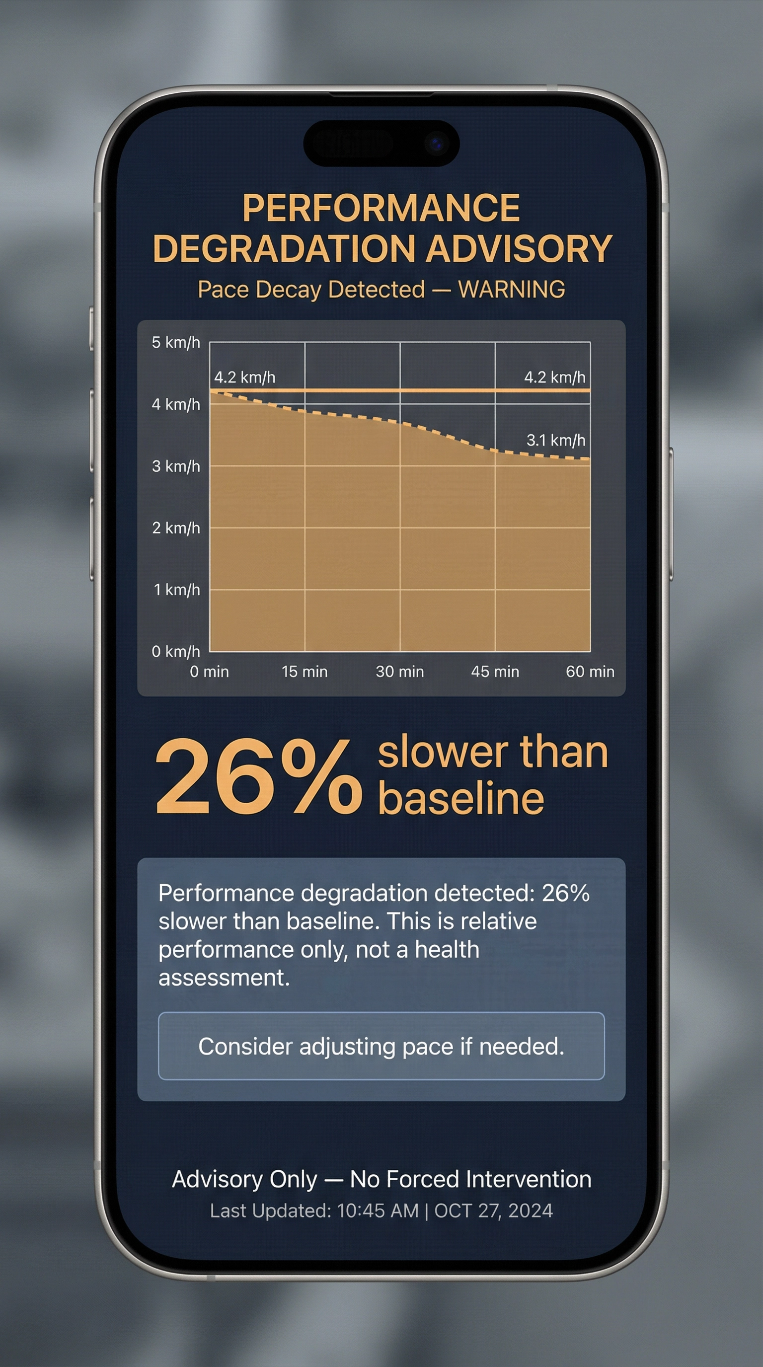 Battery and daylight interventions are based on deterministic calculations derived from real-time sensor data. Performance degradation detection is relative to session baseline only. All claims are governed by a formal specification system that prohibits any assertion not explicitly listed and validated.